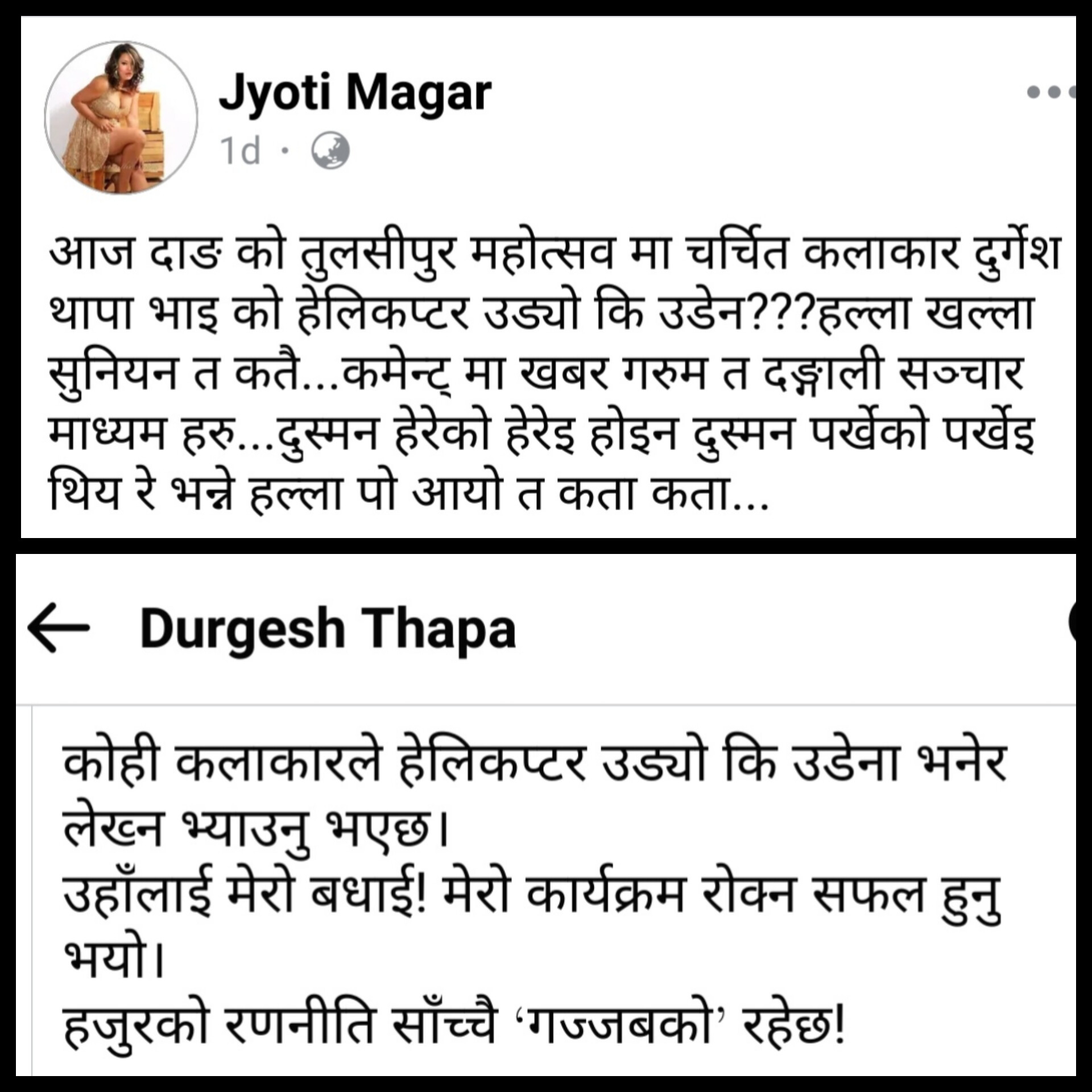 यस्तै दुर्गेशले दाङको कार्यक्रम रोकिनुमा गायिका ज्योति मगरप्रति लक्षित गरेको देखिन्छ । दूर्गेशको स्ट्याटस अघि ज्योतिले आफ्नो फेसबुकमा दुर्गेशको नाम नै तोकेर “आज दाङ को तुलसीपुर महोत्सव मा चर्चित कलाकार दुर्गेश थापा भाइ को हेलिकप्टर उड्यो कि उडेन???हल्ला खल्ला सुनियन त कतै…कमेन्ट् मा खबर गरुम त दङ्गाली सञ्चार माध्यम हरु…दुस्मन हेरेको हेरेइ होइन दुस्मन पर्खेको पर्खेइ थिय रे भन्ने हल्ला पो आयो त कता कता” भन्दै स्ट्याटस लेखेकि थिइन् ।
