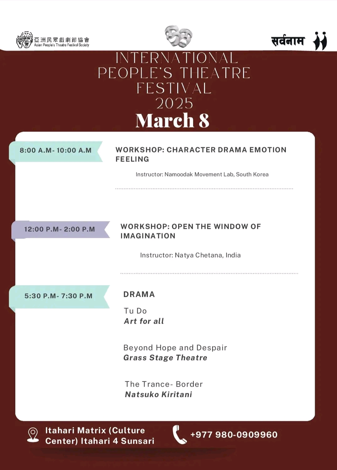यस्तै आज फागुन २४ गते बिहान ८ बजेदेखि १० बजेसम्म साउथ कोरियाको नामोदाक मुभमेन्ट ल्याबले नाट्य कार्यशाला गर्नेछ । त्यस्तै १२ बजेदेखि २ बजेसम्म नाट्य चेतना, भारतले नाट्य कार्यशाला गर्नेछ भने साँझ ५:३० देखि ७:३० बजेसम्म ३ ओटा नाटक मञ्चन गरिनेछ । यो समयमा आर्ट फर अलले ‘टुडो’, ग्रास स्टेज थियटरले ‘बियोन्ड होप एण्ड डिस्पेयर’ र नटसुको किरिटानीले ‘द ट्रान्स बोर्डर’ नामक नाटक मञ्चन गर्नेछन् ।
