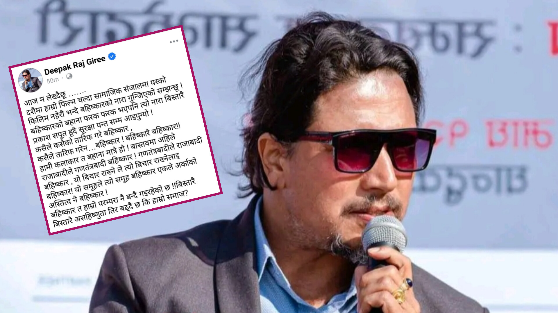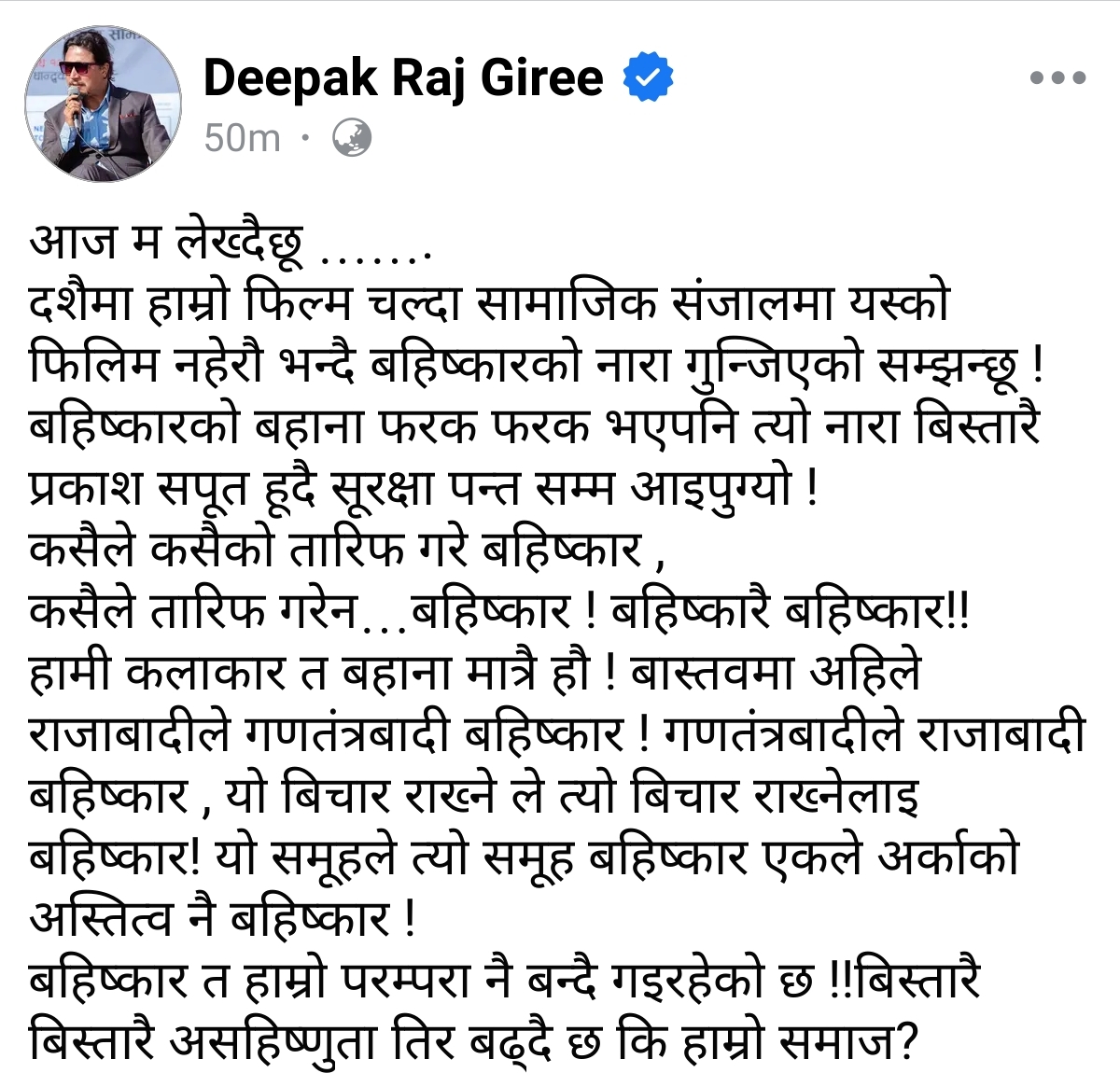 इटहरी/ चर्चित कलाकार तथा फिल्म निर्माता, निर्देशक दीपक राज गिरीले नेपाली समाजमा पछिल्लो समय सामाजिक सञ्जाल मार्फत देखिँदै आएको बहिष्कारको प्रवृत्तिबारे आफ्नो धारणा व्यक्त गरेका छन् । उनले एक फेसबुक स्ट्याटस मार्फत बहिष्कारको यो संस्कृतिले समाजमा असहिष्णुता बढाउँदै लगेको भन्दै चिन्ता व्यक्त गरेका हुन् ।