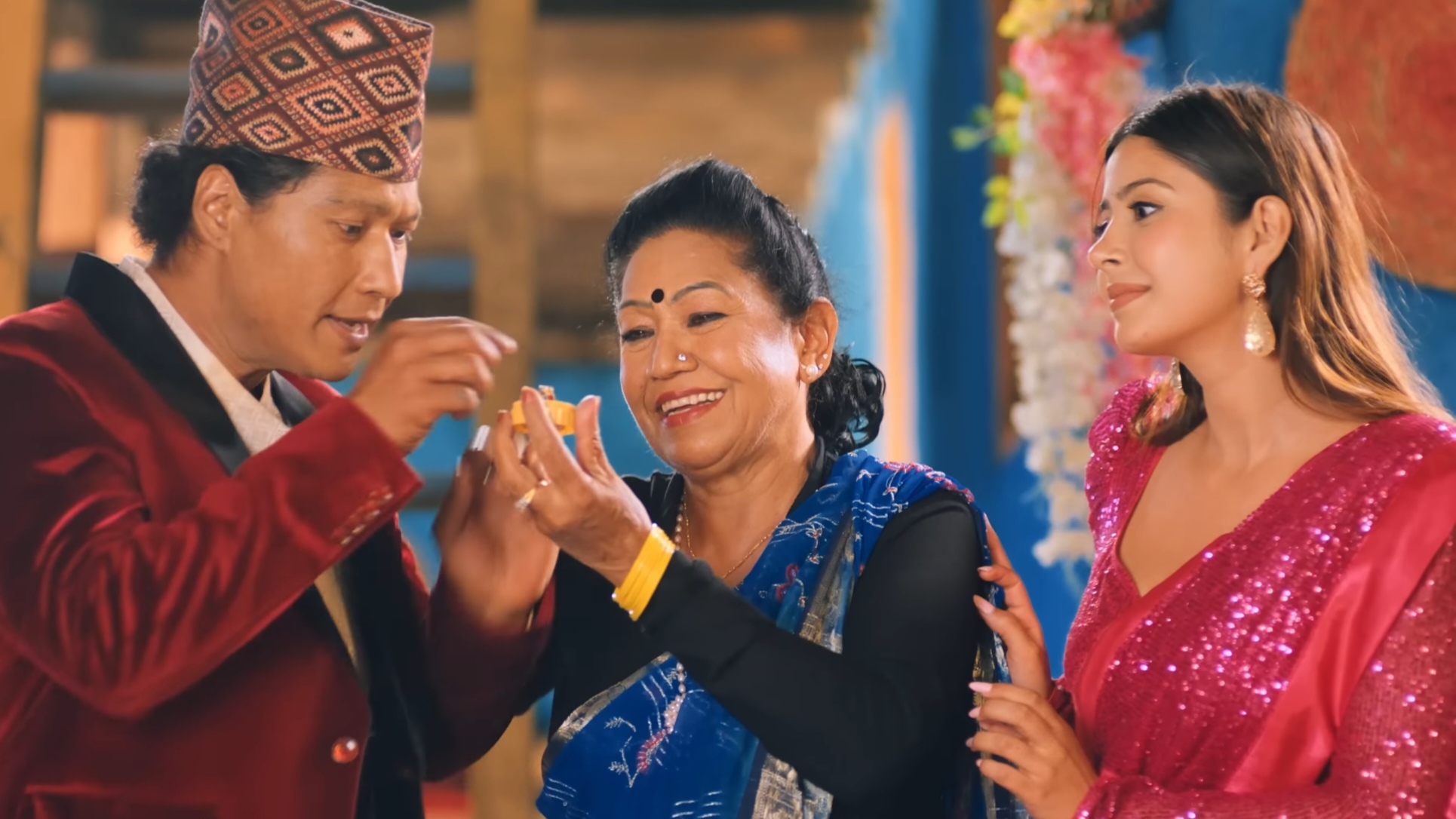 गीतको कोरियोग्राफी प्रदीप लामाले र सम्पादन लोकेश बज्राचार्यले गरेका हुन् । निर्देशक सिमोश सुनुवारका अनुसार, फिल्म नेपाली विवाह संस्कृतिमा बेहुली पक्षले जन्तीलाई खेतबारी वा खुला ठाउँमा खुवाउने परम्परा – ‘जन्ते बाख्रो’ – माथि केन्द्रित छ । फिल्ममा रमेश शाह, कमल देवकोटा, रुषा न्यौपाने, रमा थपलिया, कुसुम शर्मा, स्नेहा जोशी, समापिका गौतम, कुशल गजमेर लगायतका कलाकारहरूको पनि अभिनय रहेको छ । हेर्नुस् भिडियो ।