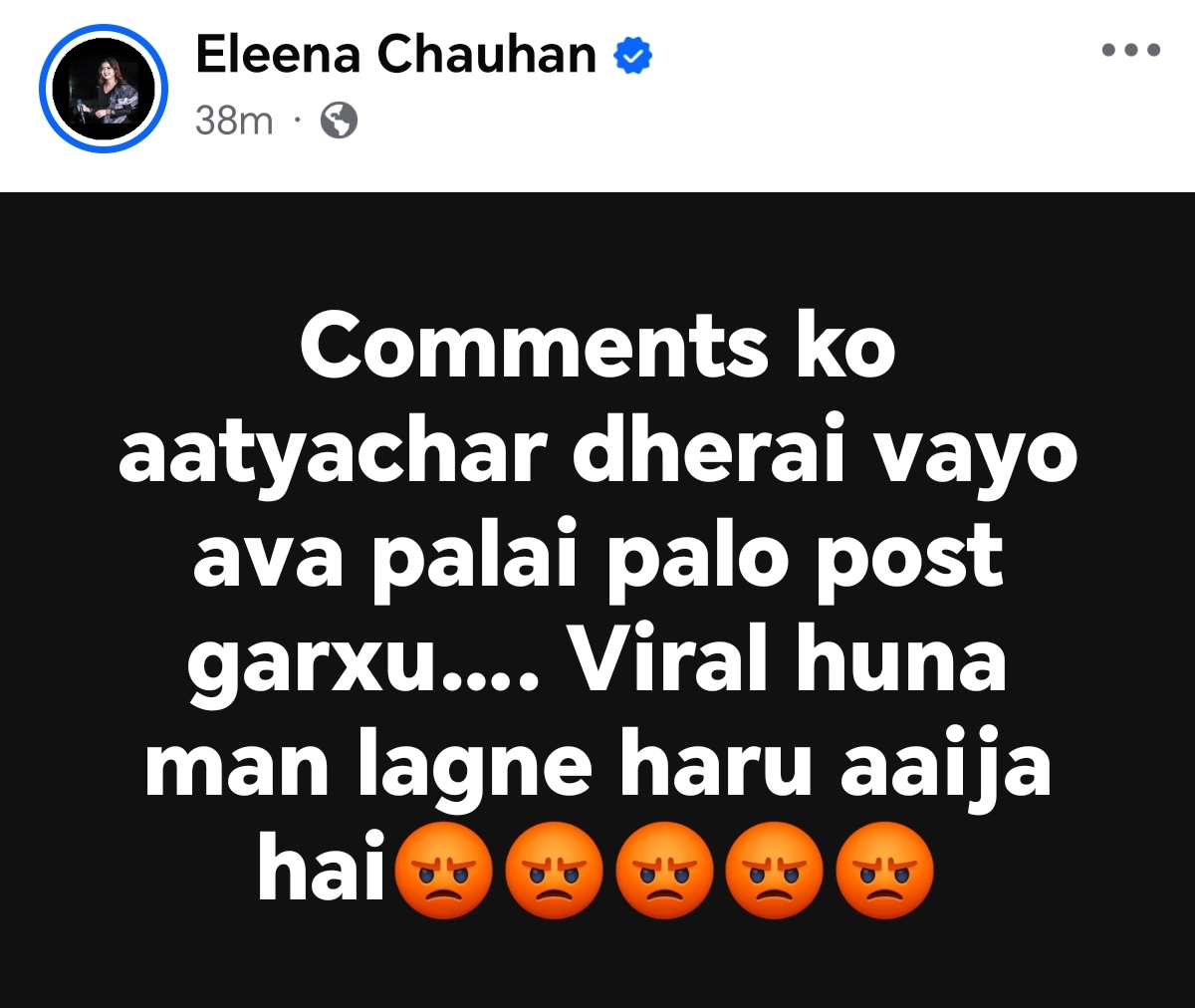 उनले आफ्नो आधिकारिक फेसबुक पेजमा एक स्ट्याटस लेख्दै आक्रोश पोखेकी छिन् । एलिना चौहानले लेखेकी छिन्, “कमेन्ट्सको अत्याचार धेरै भयो अब पालै पालो पोस्ट गर्छु….भाइरल हुन मन लाग्नेहरू आइज है।” उनको यो भनाइले सामाजिक सञ्जालमा कलाकार, विशेषगरी महिला कलाकारहरूले व्यक्तिगत जीवनका उतारचढावका कारण सामना गर्नुपर्ने दुर्व्यवहारलाई प्रस्ट पारेको छ । सो स्ट्याटस पछि उनले अभद्र कमेन्ट गर्नेको कमेन्ट सहित फोटो र फेसबुक लिंक सहित सार्वजनिक गर्न थालेकी छन् ।