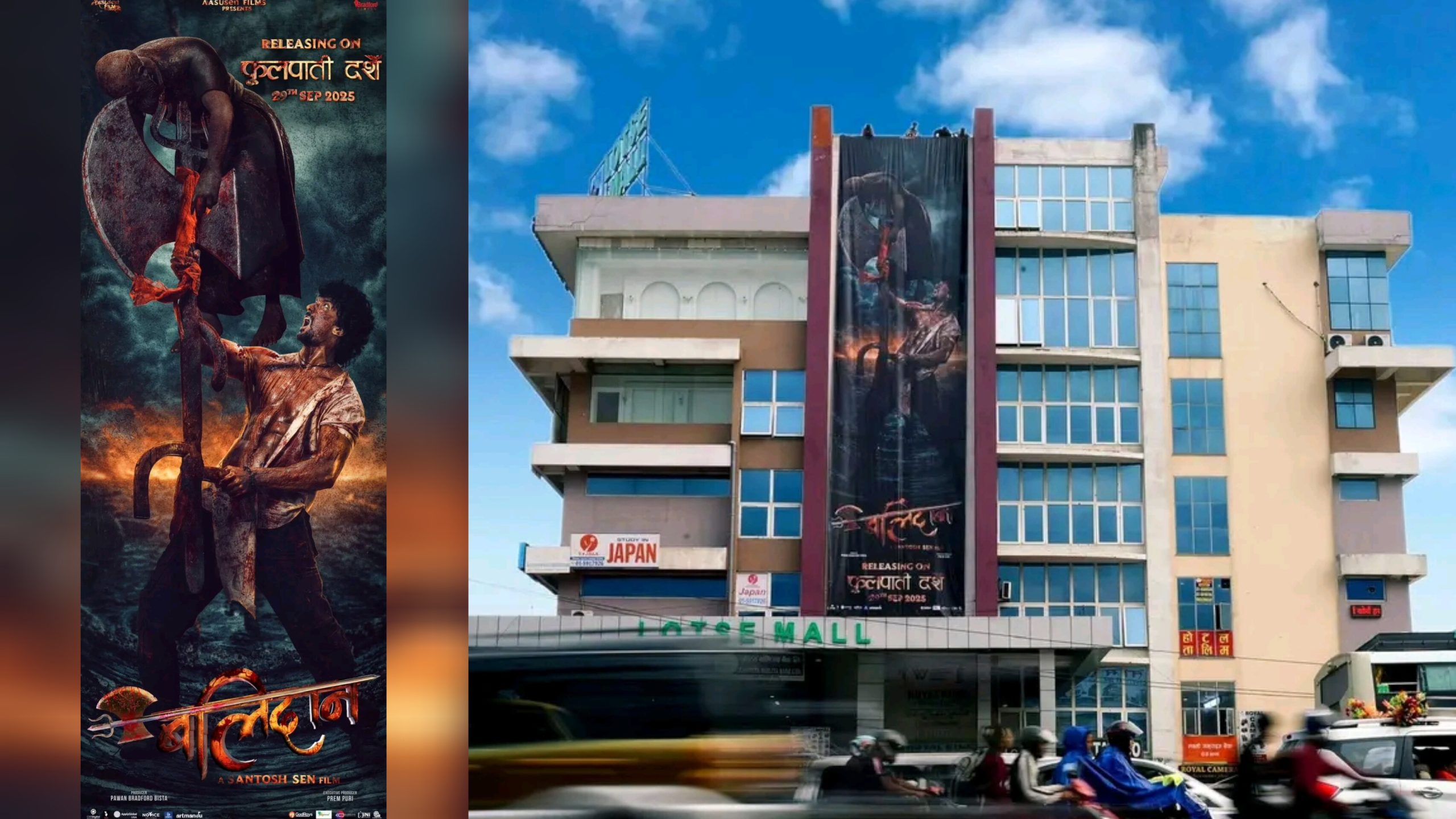 इटहरी/ नेपाली फिल्म उद्योगमा यसपालिको वडा दशैं विशेष बन्ने देखिएको छ । त्यो पनि बहुप्रतीक्षित फिल्म ‘बलिदान’ले ल्याएको दृश्यात्मक क्रान्तिका कारण । दशैंको फूलपातीको उत्सवसँगै फिल्मको ६० फिट अग्लो र १६ फिट चौडा विशाल पोस्टर सार्वजनिक गर्दै फिल्म निर्माण युनिटले प्रचारप्रसारको नयाँ अभ्यास सुरु गरेको छ । बिहीबार काठमाडौंको गोङ्गबुस्थित ल्होत्से मलको बाहिरी भागमा राखिएको उक्त पोस्टरले नयाँ शैलीको सुरूवात गरेकाे छ ।