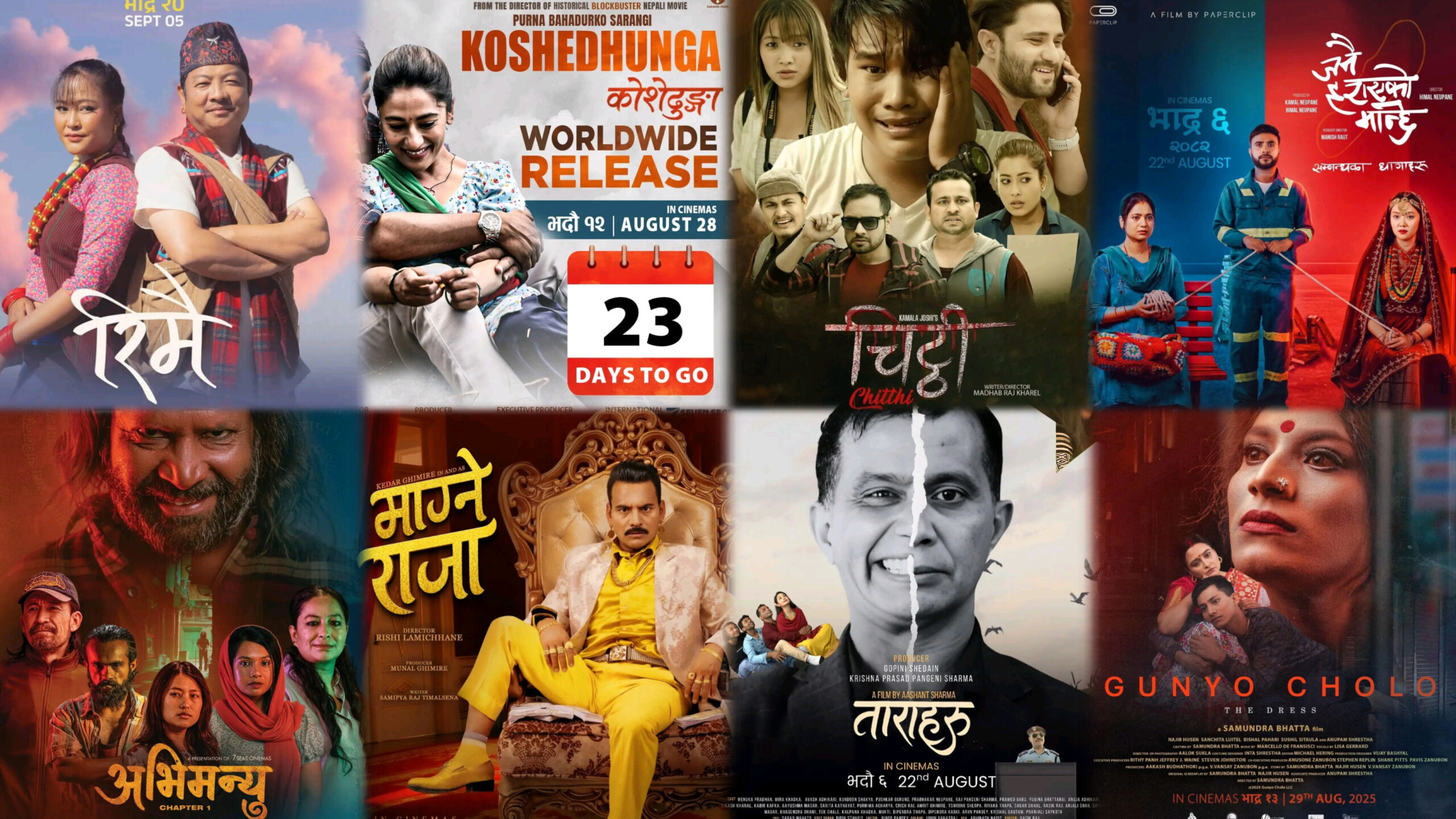 भदौ महिना नेपाली फिल्म हलका लागि निकै व्यस्त, प्रतिस्पर्धात्मक र बहुरंगी बन्ने देखिएको छ । यतिबेला भदौ महिनाका यी ८ फिल्महरू जनै हराएको मान्छे, माग्ने राजा, ताराहरु, कोशेढुंगा, गुन्यु चोलो, रीमै, चिट्ठी र अभिमन्यु मध्ये केहीले प्रचारलाई आक्रामक बनाइरहेका छन् भने केहीले प्रचारमा ध्यान नै दिएका छैनन् भन्दा फरक नपर्ला । अब, यी फिल्महरूको बक्स अफिस कलेक्सन कस्तो आउनेछ भन्ने कुरा भने प्रतिक्षाको विषय बनेको छ ।