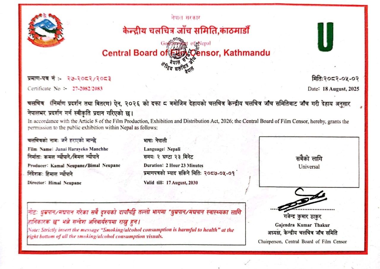 इटहरी/ प्रतिक्षित नेपाली फिल्म ‘जनै हराएको मान्छे : सम्बन्धका धागाहरू’ भदौ ६ गते देखि देशभरका फिल्म हलमा प्रदर्शन हुँदैछ । हालै सेन्सर बोर्डबाट ‘यू’ (Universal) सर्टिफिकेट प्राप्त गरेको छ । अब यस फिल्म सबै उमेर समूहका दर्शकले हेर्न मिल्ने प्रमाणपत्र दिएको हो । २ घण्टा २३ मिनेटको रहेको यस फिल्मले आफ्नो नाममा रहेको रहस्यमय ‘जनै’को कथाले दर्शकको उत्सुकता बढाएको छ ।
