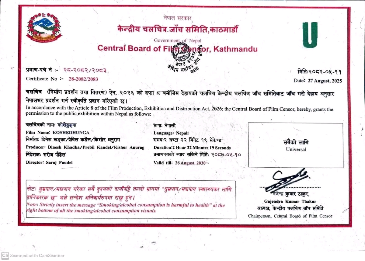 इटहरी/ नेपाली फिल्म कोशेढुंगाले सेन्सर बोर्डबाट युनिभर्सल सर्टिफिकेट प्राप्त गर्दै सबै उमेर समूहका दर्शकले हेर्न मिल्ने फिल्मको मान्यता पाएको छ । यही बिहीबारदेखि नेपालसँगै अमेरिका, अस्ट्रेलिया, जापान, युके, क्यानडालगायत ४० भन्दा बढी मुलुकमा एकैसाथ प्रदर्शनमा आउन लागेको यो फिल्मलाई दर्शकमाझ विशेष उत्सुकतासाथ प्रतीक्षा गरिएको छ ।