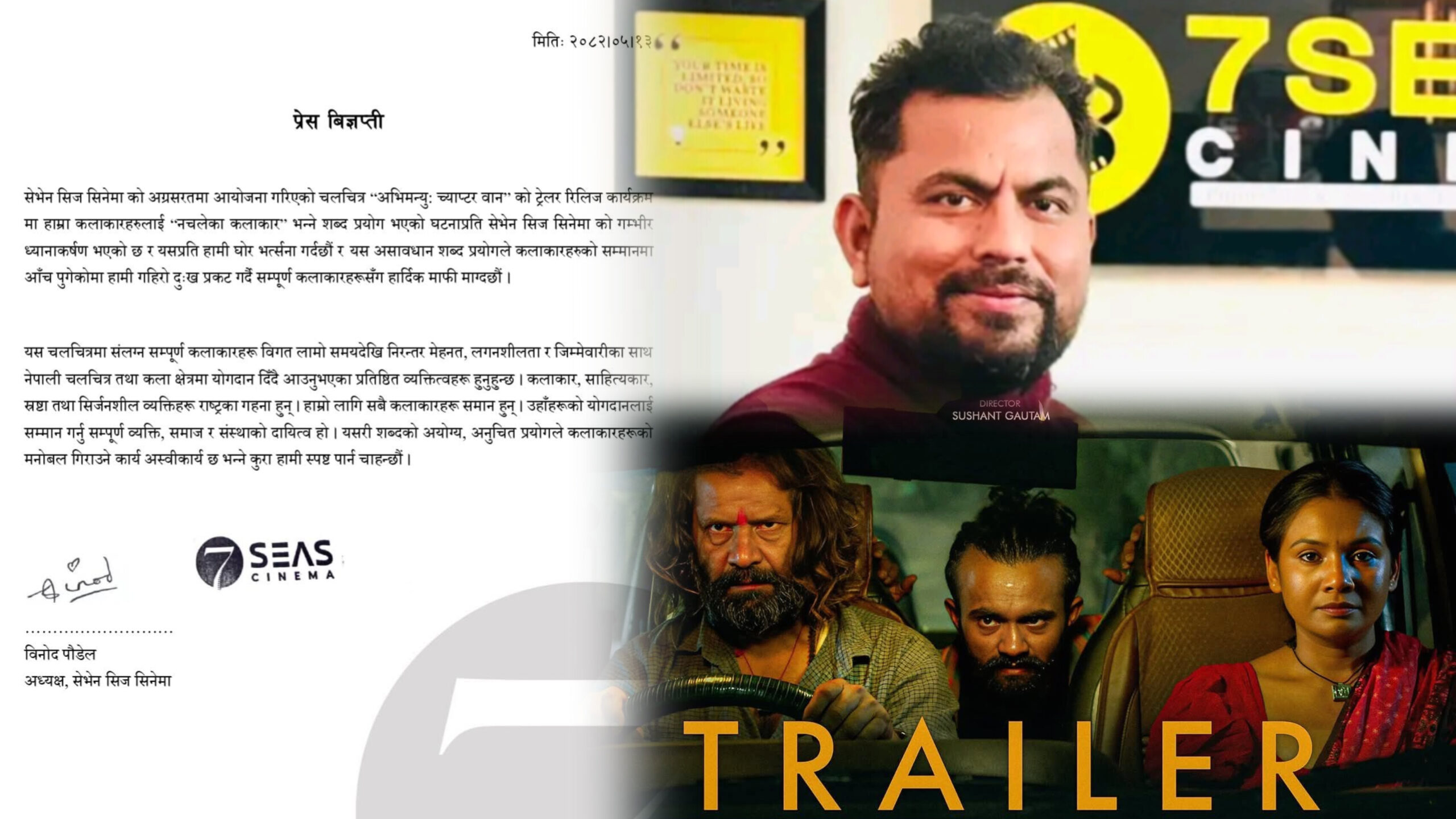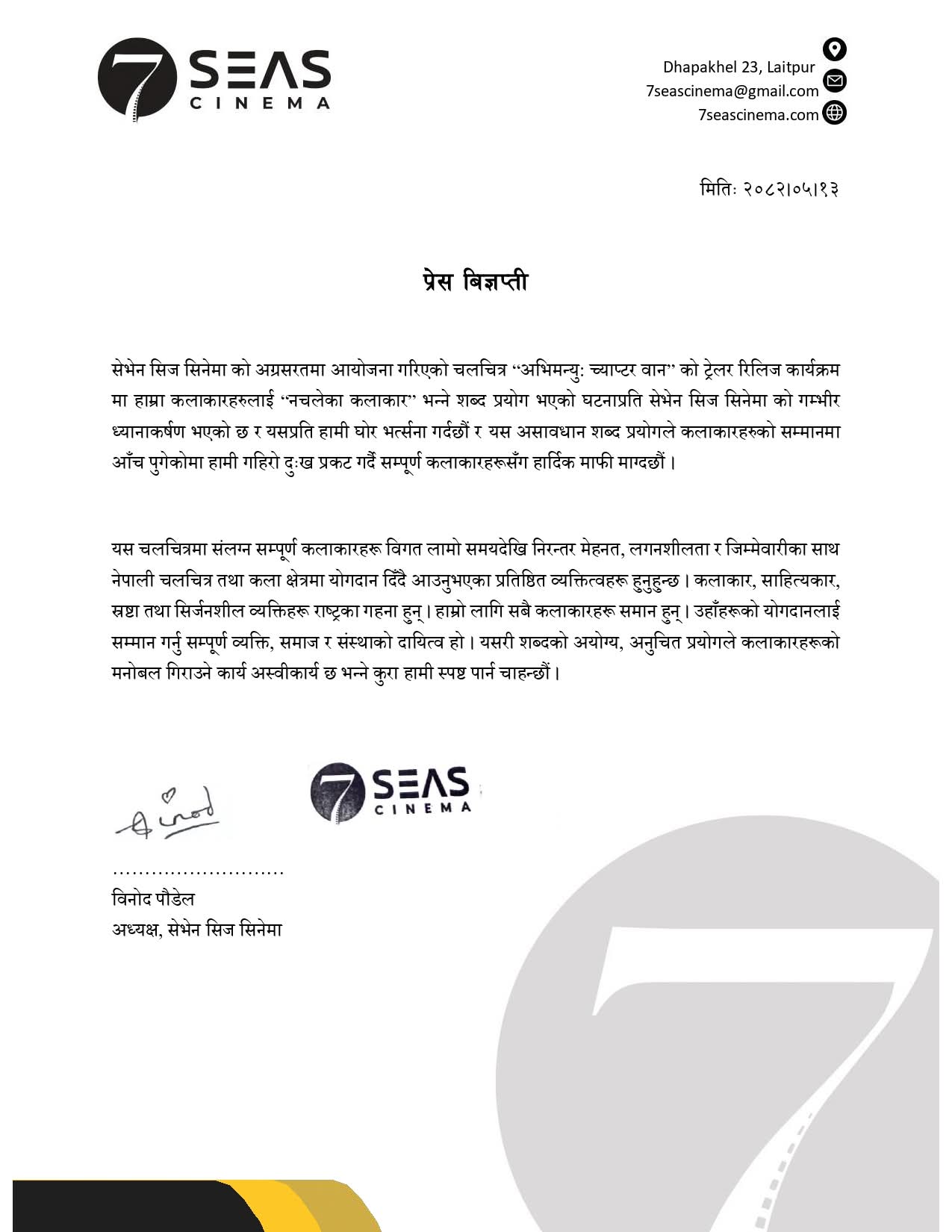 विज्ञप्तिमा भनिएको छ– “नेपाली चलचित्रका कलाकारहरूले गरेको योगदानको मूल्य अपार छ । असावधानीपूर्वक प्रयोग भएका शब्दले कलाकारको मान–सम्मानमा चोट पुर्याएकोप्रति हामी दुःख प्रकट गर्दछौं र सम्पूर्ण कलाकारसँग हार्दिक माफी चाहन्छौं।” निर्माता पौडेलले फिल्म क्षेत्रका कलाकार, साहित्यकार, निर्देशक र सिर्जनशील व्यक्तिहरूलाई समाज र संस्कृतिको धरोहर बताउँदै, कलाकारलाई सम्मान गर्नु सम्पूर्ण व्यक्ति, समाज र संस्थाको दायित्व भएको जोड दिएका छन् ।