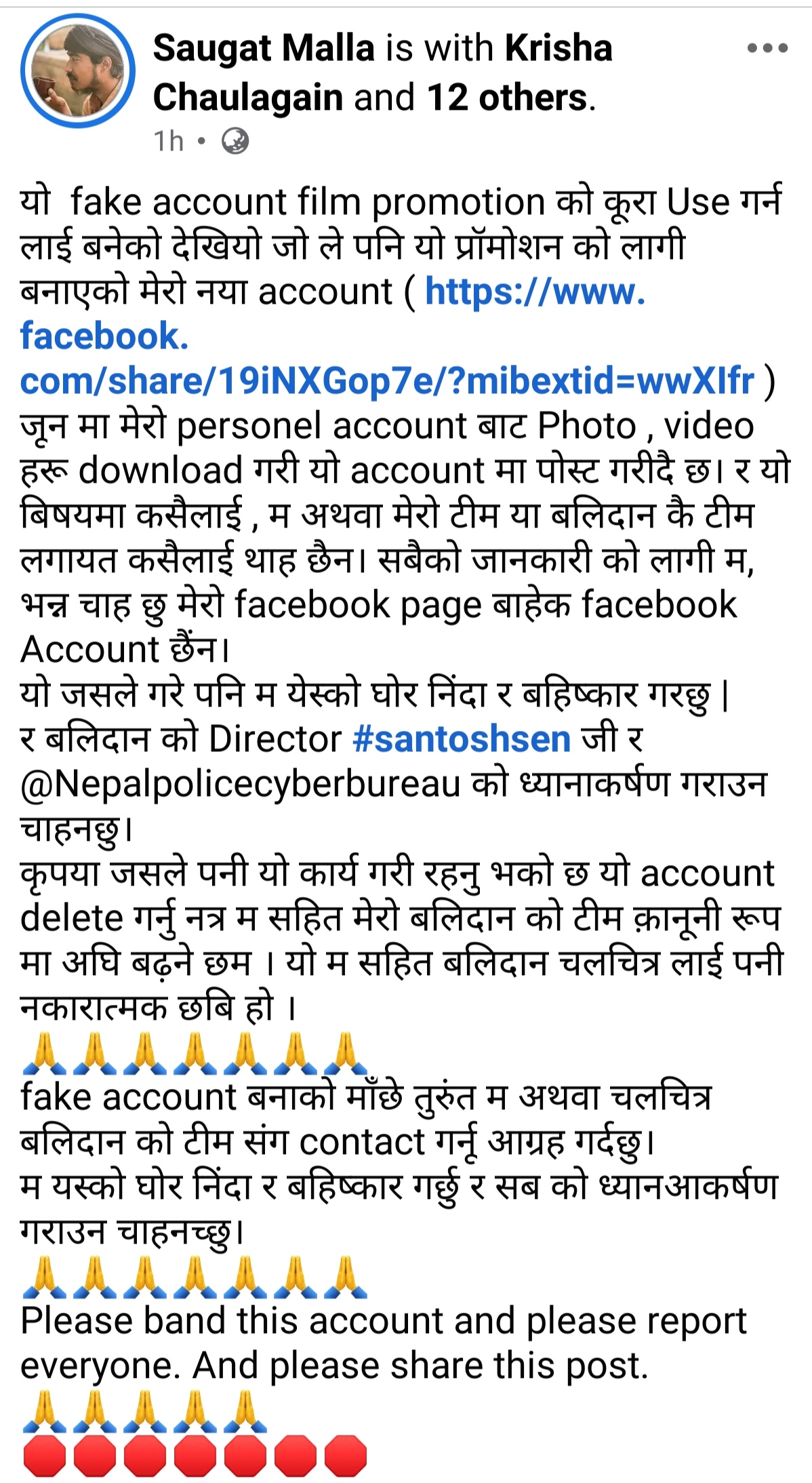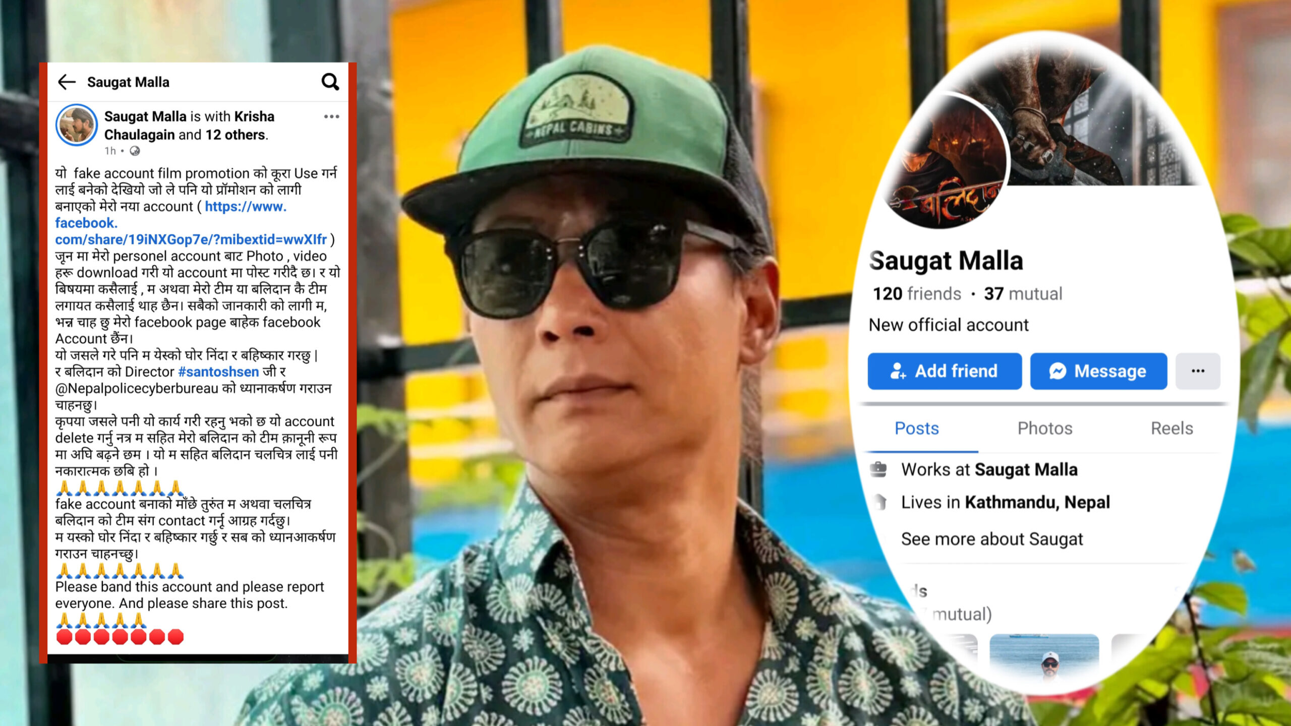 इटहरी/ अभिनेता सौगात मल्लले आफ्नो नाम र व्यक्तिगत सामग्री प्रयोग गर्न बनाइएको नक्कली फेसबुक खाता मार्फत फिल्म बलिदानको प्रचार गरिएको भन्दै सार्वजनिक रुपमा आपत्ति जनाएका छन् । उनले शनिबार सामाजिक सञ्जालमा एक पोस्ट गर्दै यस्तो कार्यको विरोध गरेका हुन् । उनले सो कार्यबारे निर्देशक सन्तोष सेन र नेपाल प्रहरी साइबर ब्यूरोलाई ध्यानाकर्षण गराउँदै दोषीविरुद्ध कानुनी कारबाही गर्न चेतावनी दिएका छन् ।