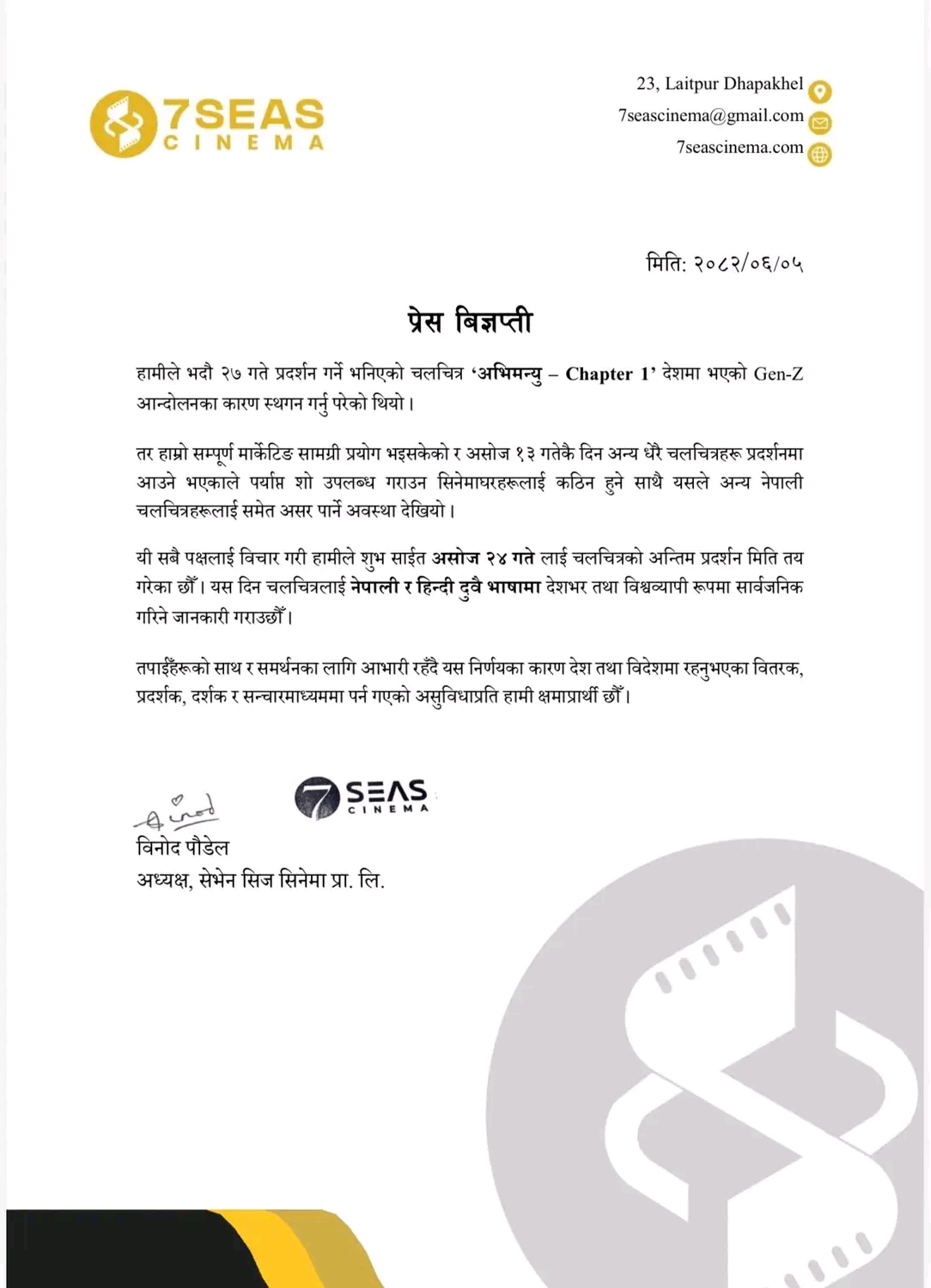 रिलिज मिति सारिएको कारणबारे आइतबार सार्वजनिक गरिएको विज्ञप्तिमा भनिएको छ, असोज १३ गते चारवटा नेपाली फिल्म एकैसाथ आउन लागेकाले शो संख्या घट्ने सम्भावना बढेको र वितरक–प्रदर्शकहरूको आग्रहअनुसार नयाँ मिति तोकिएको हो । यसअघि भदौ २७ गते प्रदर्शन गर्ने योजना भए पनि देशमा भएको Gen-Z आन्दोलनका कारण फिल्म रोकिएको थियो ।