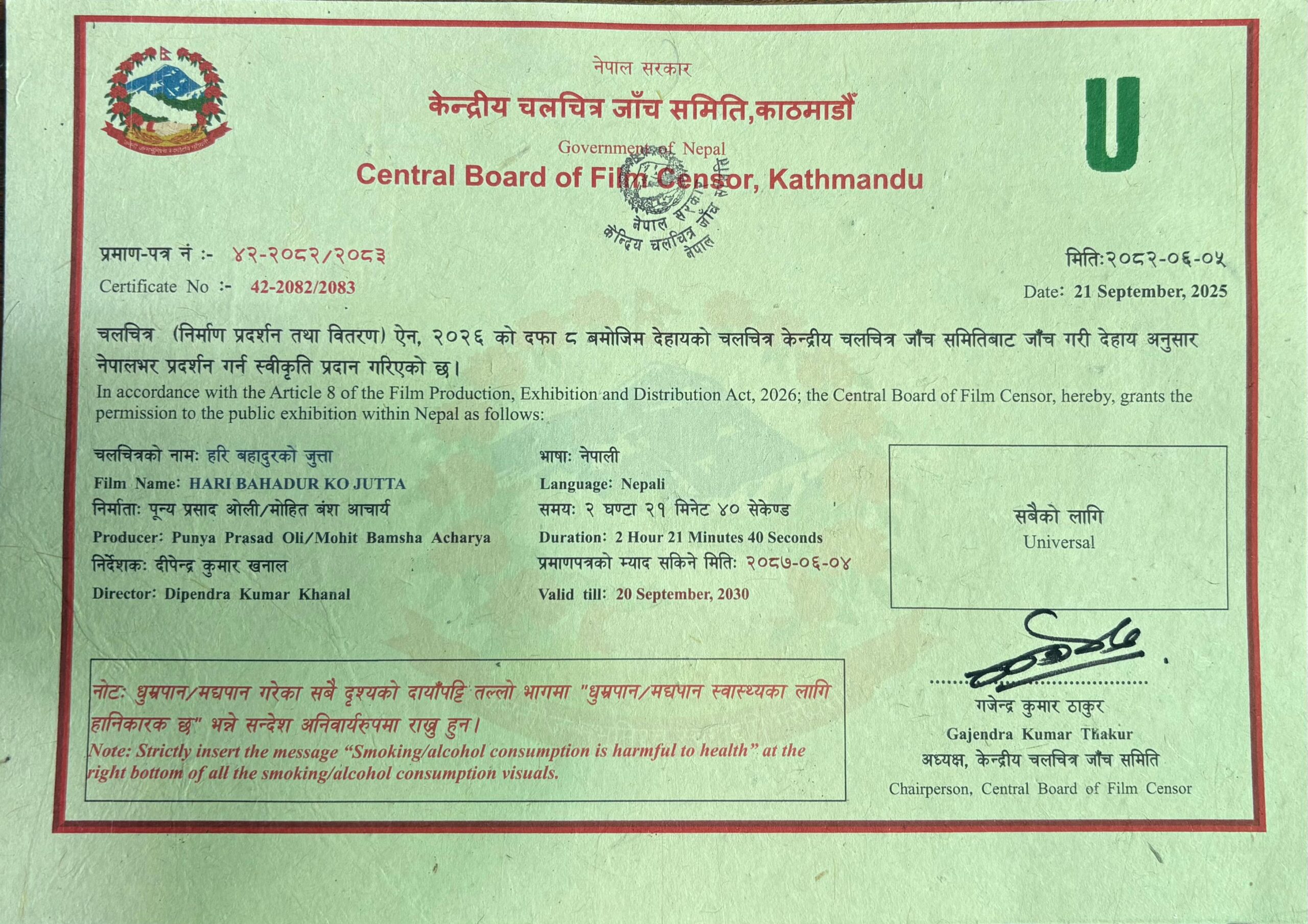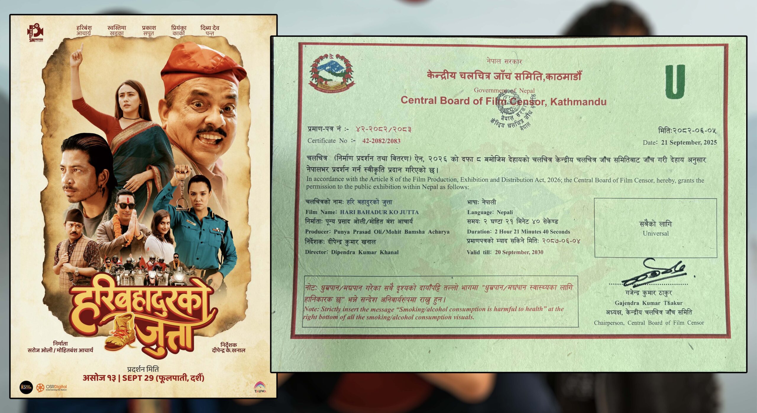 इटहरी/ फिल्म ‘हरिबहादुरको जुत्ता’ लाई सेन्सर बोर्डले ‘युनिभर्सल’ सर्टिफिकेट दिएको छ । अब यो फिल्म सबै उमेर समूहका दर्शकले हेर्न पाउनेछन् । सेन्सर बोर्डका सदस्यहरु फिल्मको क्लाइमेक्स हेरेर भावुक बनेका थिए र हाँसोसँगै आँसु पनि ल्याउने खालको फिल्म रहेको प्रतिक्रिया दिएका छन् । दसैँको फूलपाती अर्थात् यहि असोज १३ गतेदेखि प्रदर्शनमा आउन लागेको यो फिल्मको निर्देशन दीपेन्द्र के खनालले गरेका हुन् ।
