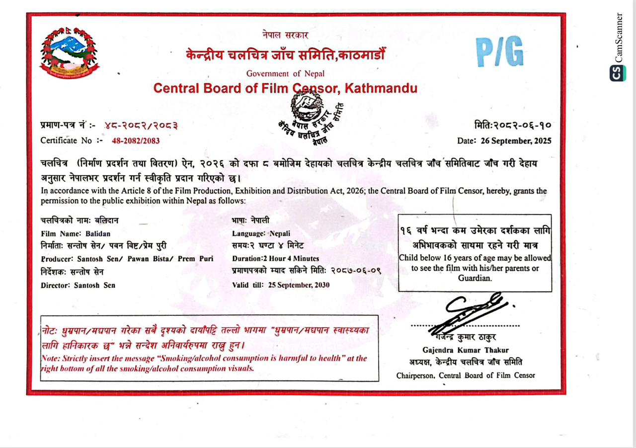 समितिको निर्णयअनुसार फिल्म सबै उमेर समूहका दर्शकले हेर्न सक्ने भए पनि अभिभावकको मार्गदर्शन आवश्यक पर्नेछ । सन्तोष सेनको निर्देशनमा बनेको ‘बलिदान’मा समीर भट्ट, सौगात मल्ल, अर्पण थापा, ऋचा शर्मा, कविता राय, हेमन्त बुढाथोकी, प्रेम पुरीलगायत चर्चित कलाकारहरूको दमदार अभिनय समावेश छ ।