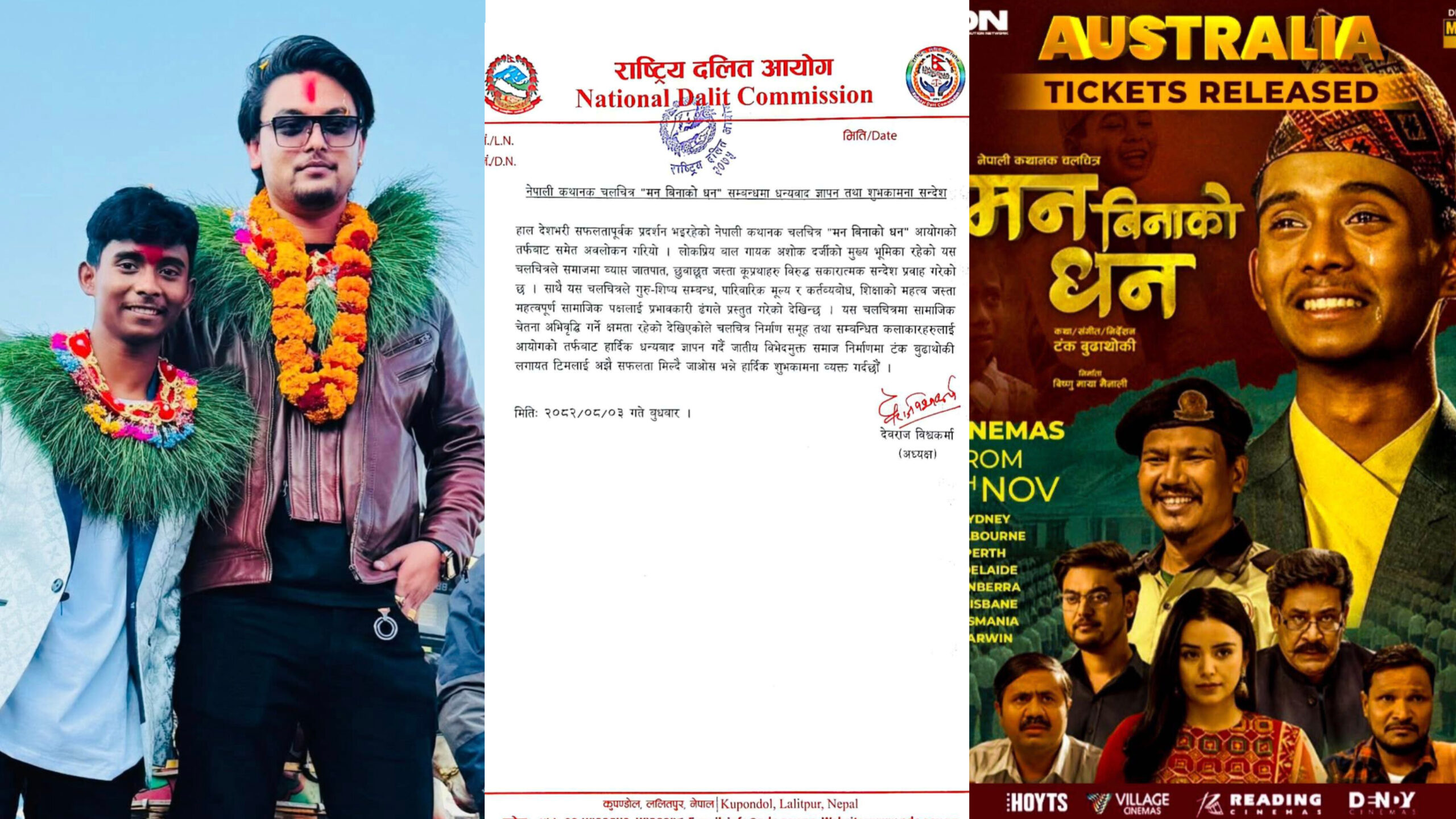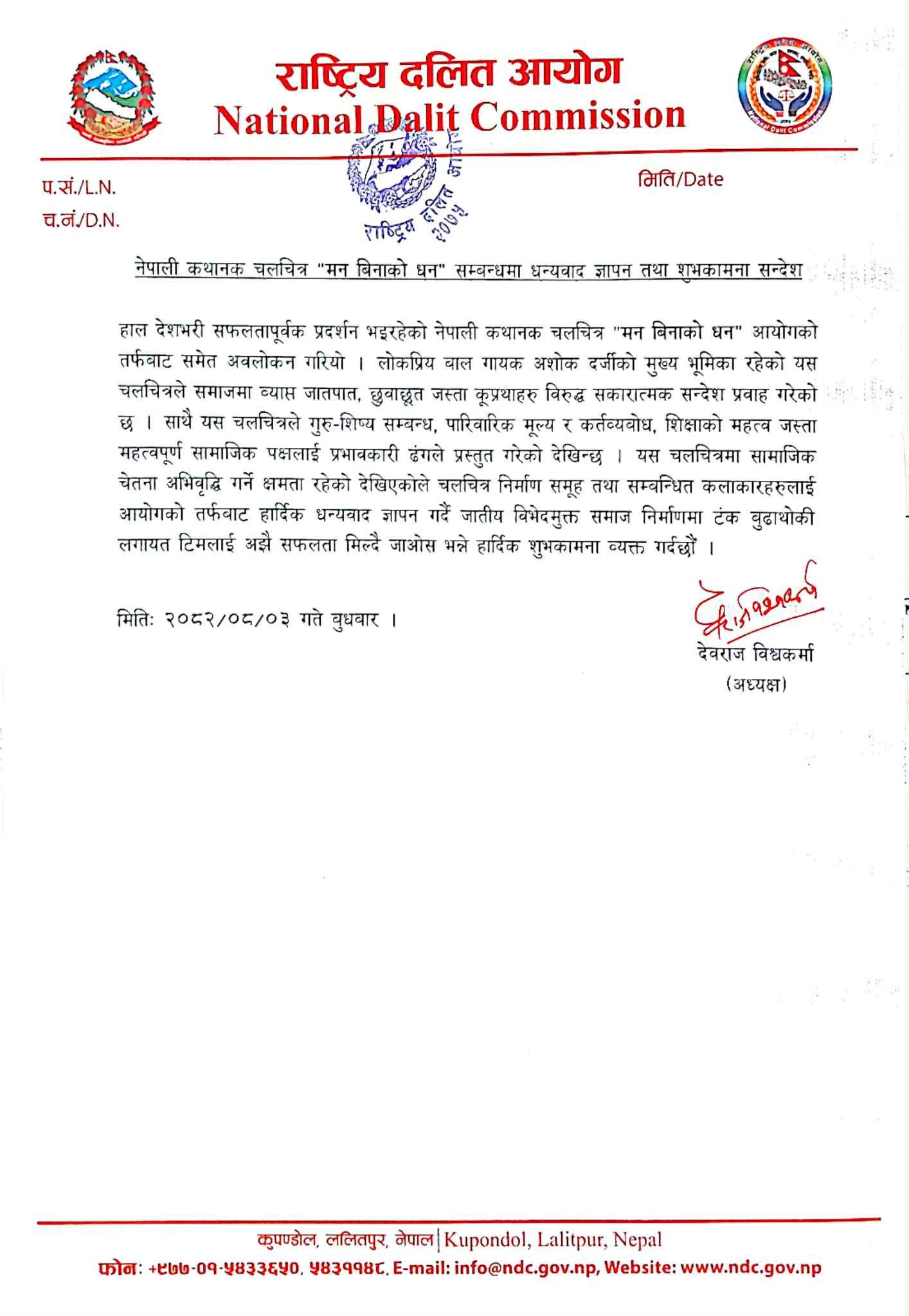 इटहरी/ सामाजिक मुद्दालाई प्रभावकारी ढङ्गले उठान गरेको भन्दै राष्ट्रिय दलित आयोगले भोलिदेखि तेस्रो सातामा प्रवेश गर्न लागिरहेको नेपाली फिल्म ‘मन बिनाको धन’लाई औपचारिक शुभकामना दिएको छ । आयोगका अध्यक्ष देवराज विश्वकर्माले एक विज्ञप्ति जारी गर्दै फिल्मले जातीय छुवाछुतजस्ता कुप्रथाविरुद्ध सशक्त आवाज उठाएको उल्लेख गर्दै निर्माण टिमलाई धन्यवाद व्यक्त गरेका छन् ।