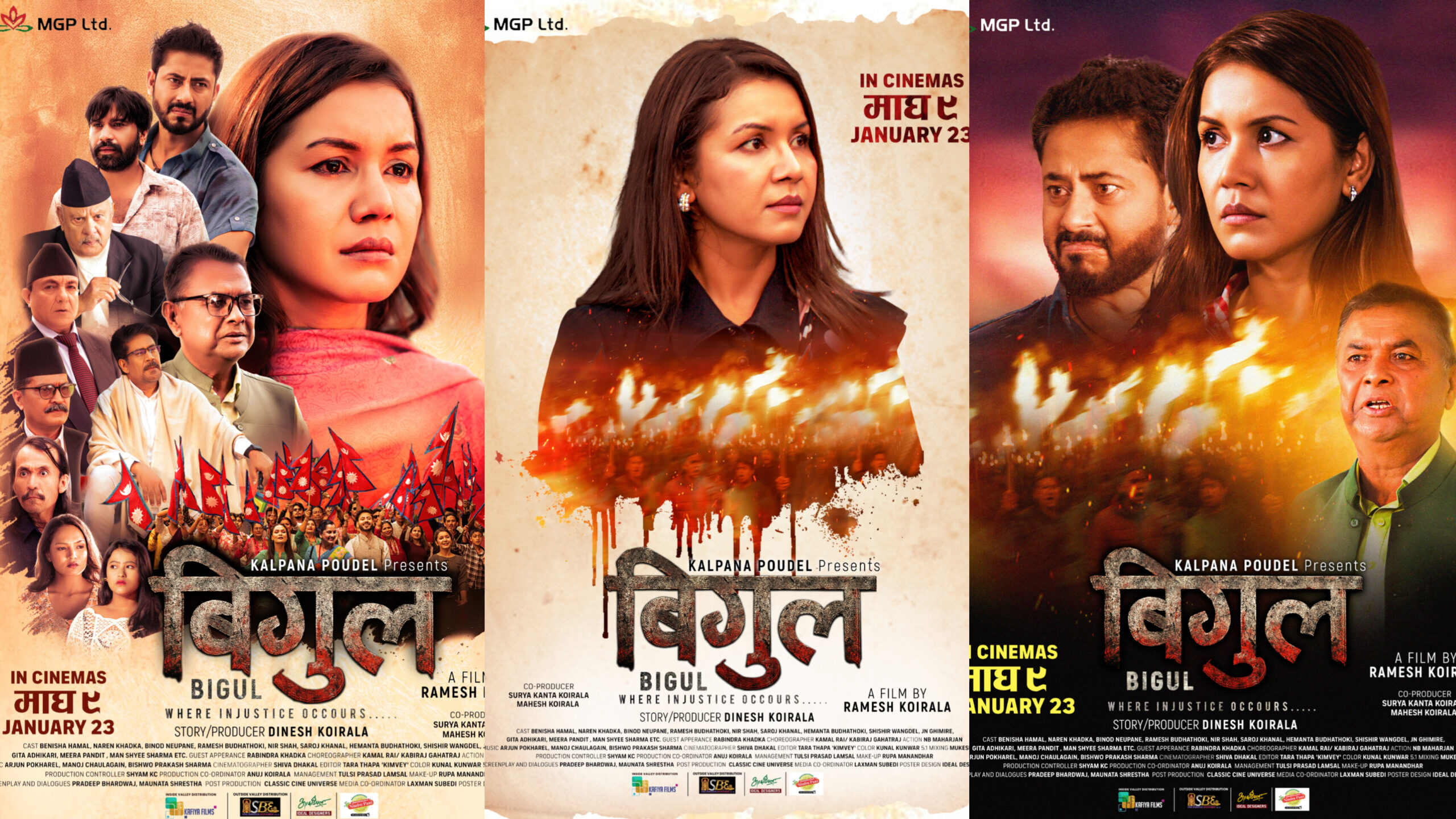 सार्वजनीक तेस्रो पोस्टरमा भने फिल्मका अन्य प्रमुख कलाकारहरूलाई समेटिएको छ । फिल्मका निर्देशक रमेश कोइरालाले ‘बिगुल’ लाई भुइँमान्छेहरूको सपना, संघर्ष र बलिदानीको इतिहासको रूपमा व्याख्या गरेका छन् । उनले भने, ‘‘यसले मनोरञ्जनका साथै सामाजिक न्याय र महिलाले गर्नुपरेको संघर्षको पारिवारिक कथा पनि बोल्छ ।’’