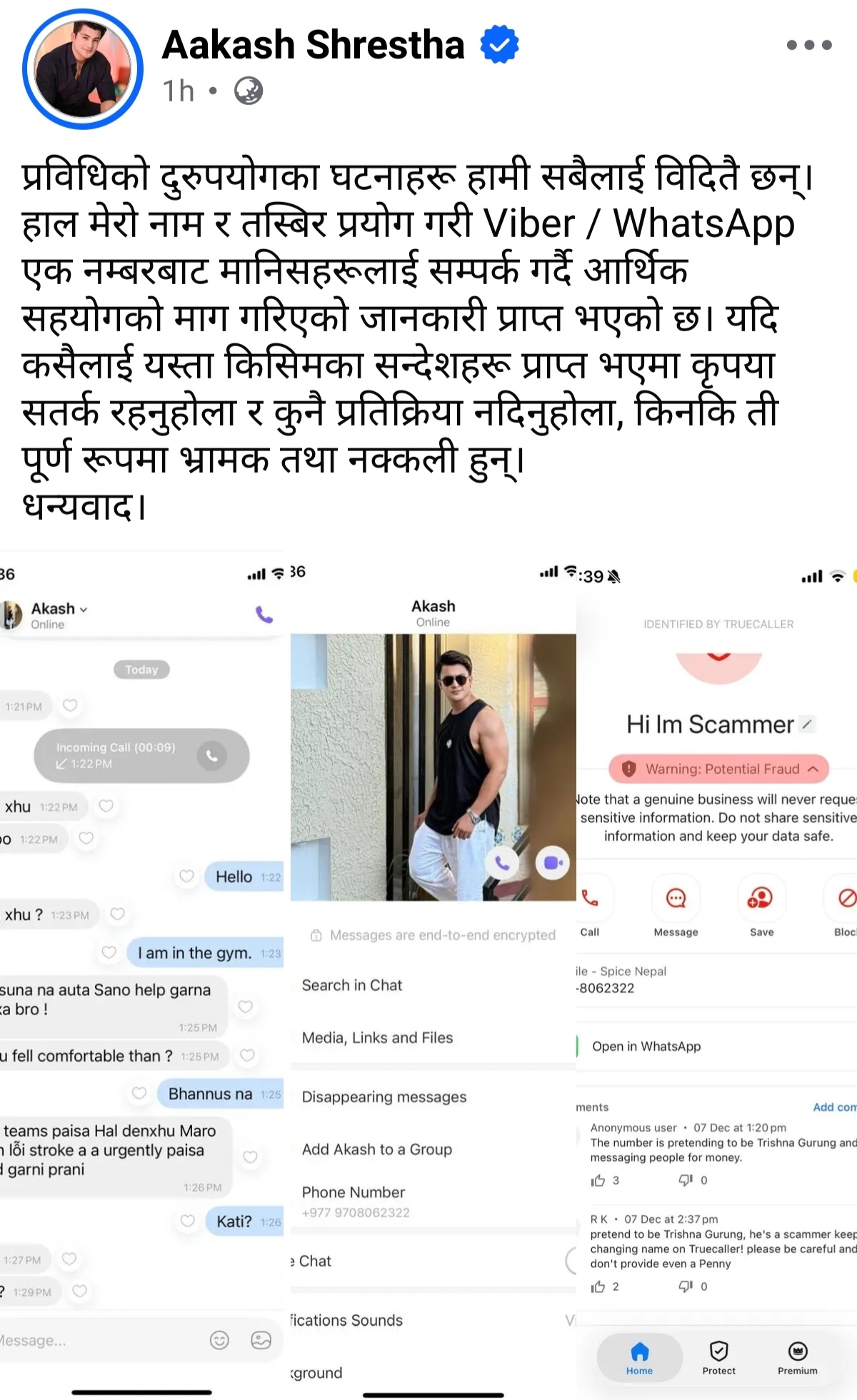 यसैगरी, अभिनेता आकाश श्रेष्ठले प्रविधिको दुरुपयोगका घटनाप्रति चिन्ता व्यक्त गरेका छन् । उनले एक नम्बरबाट आफ्नो नाममा आर्थिक सहयोग मागिएको बताउँदै भनेका छन्, “यदि कसैलाई यस्ता किसिमका सन्देशहरू प्राप्त भएमा कृपया सतर्क रहनुहोला र कुनै प्रतिक्रिया नदिनुहोला, किनकि ती पूर्ण रूपमा भ्रामक तथा नक्कली हुन् ।”