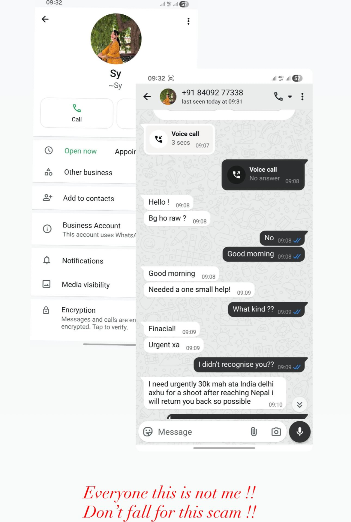 आफ्नो पहिचान दुरुपयोग गरी साथीभाइ तथा शुभचिन्तकहरूसँग रकम मागिएको जानकारी पाएपछि अभिनेत्रीहरू केकी अधिकारी, स्वस्तिमा खड्का, साम्राज्ञी राज्यलक्ष्मी शाह र अभिनेता आकाश श्रेष्ठले सामाजिक सञ्जालमार्फत सबैलाई सचेत रहन आग्रह गरेका हुन् । उनीहरूले ठगी गर्न खोजिएको च्याटको ‘स्क्रिनसट’ नै सार्वजनिक गर्दै यस्ता भ्रामक सन्देशको विश्वास नगर्न अनुरोध गरेका छन् ।