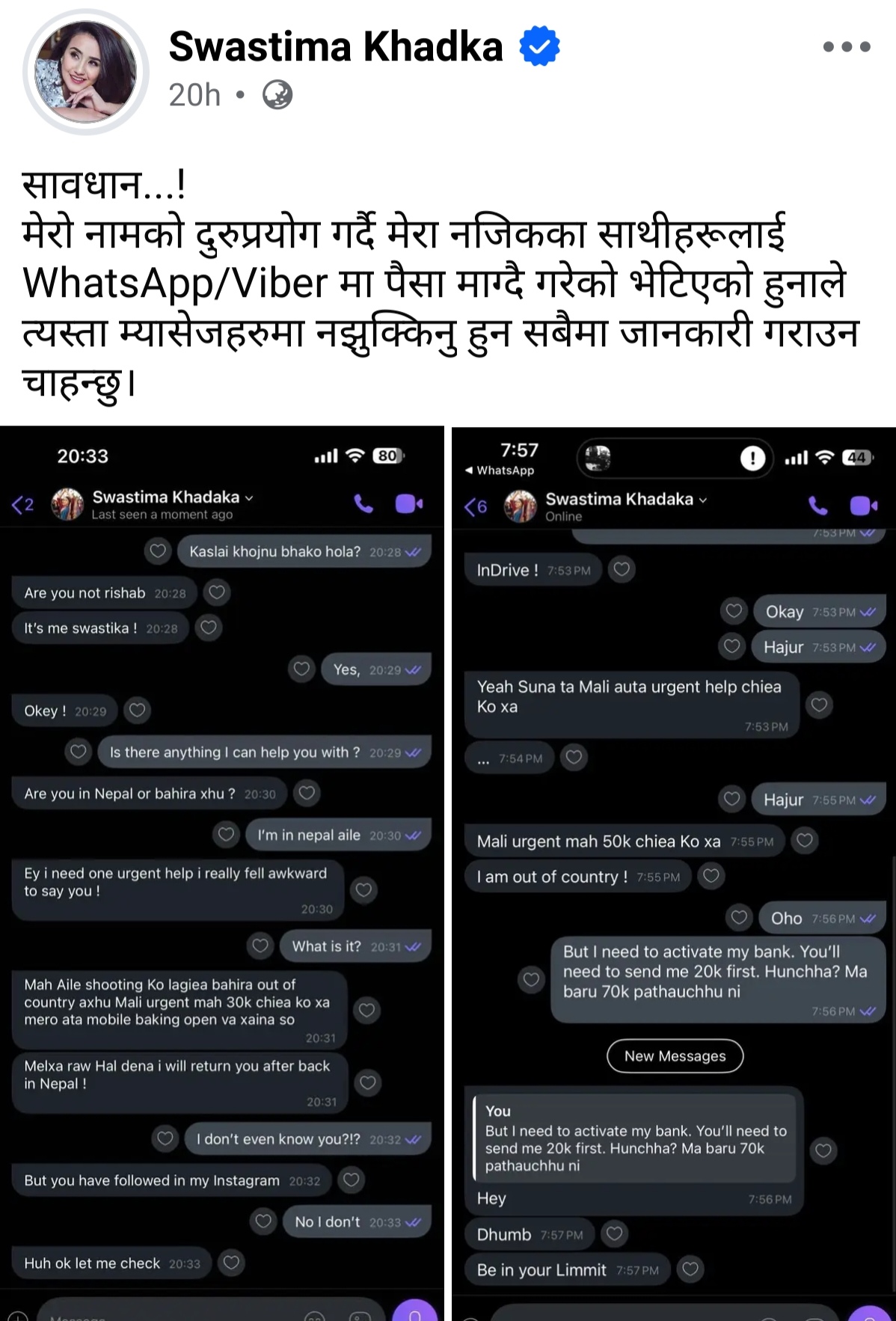 उनले स्टाटसमा स्क्रीनसट सँगै लेखेकी छन्, “सावधान…! मेरो नामको दुरुपयोग गर्दै मेरा नजिकका साथीहरूलाई पैसा माग्दै गरेको भेटिएको हुनाले त्यस्ता म्यासेजहरूमा नझुक्किनु हुन सबैमा जानकारी गराउन चाहन्छु ।”