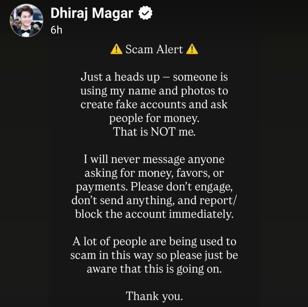 यस्तै अभिनेता धिरज मगर पनि यो समस्यामा परेका छन् । उनले आफ्नो नाम र तस्बिर प्रयोग गरी सामाजिक सञ्जालमा ठगी भइरहेको भन्दै फ्यानहरूलाई सचेत गराएका छन् ।