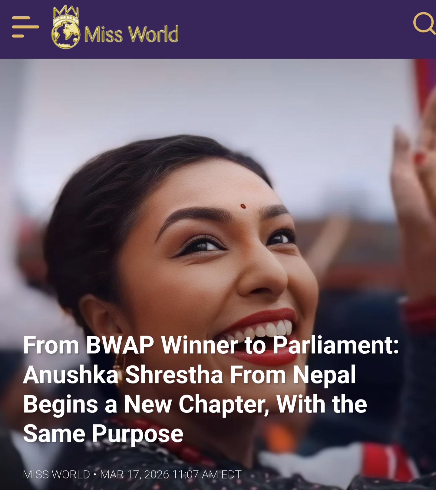 प्रभावशाली सार्वजनिक व्यक्तित्व र युवा आवाजहरूलाई शासन प्रणालीमा जोड्ने प्रयासस्वरूप उनलाई यो जिम्मेवारी दिइएको हो । अनुष्काको यो नयाँ राजनीतिक यात्रालाई मिस वर्ल्डको आधिकारिक वेबसाइट ले विशेष स्थान दिएको छ । साथै, मिस वर्ल्डको आधिकारिक फेसबुक पेजमा समेत उनको यो उपलब्धिलाई निकै महत्त्वका साथ पोस्ट गरिएको छ । लन्डनमा आयोजित ६९औँ मिस वर्ल्ड प्रतियोगितामा शीर्ष १२ भित्र पर्न सफल अनुष्काले ‘मल्टिमिडिया च्यालेन्ज’ र ‘ब्युटी विथ अ पर्पज’ दुवै जितेर नेपालको नाम चम्काएकी थिइन् ।