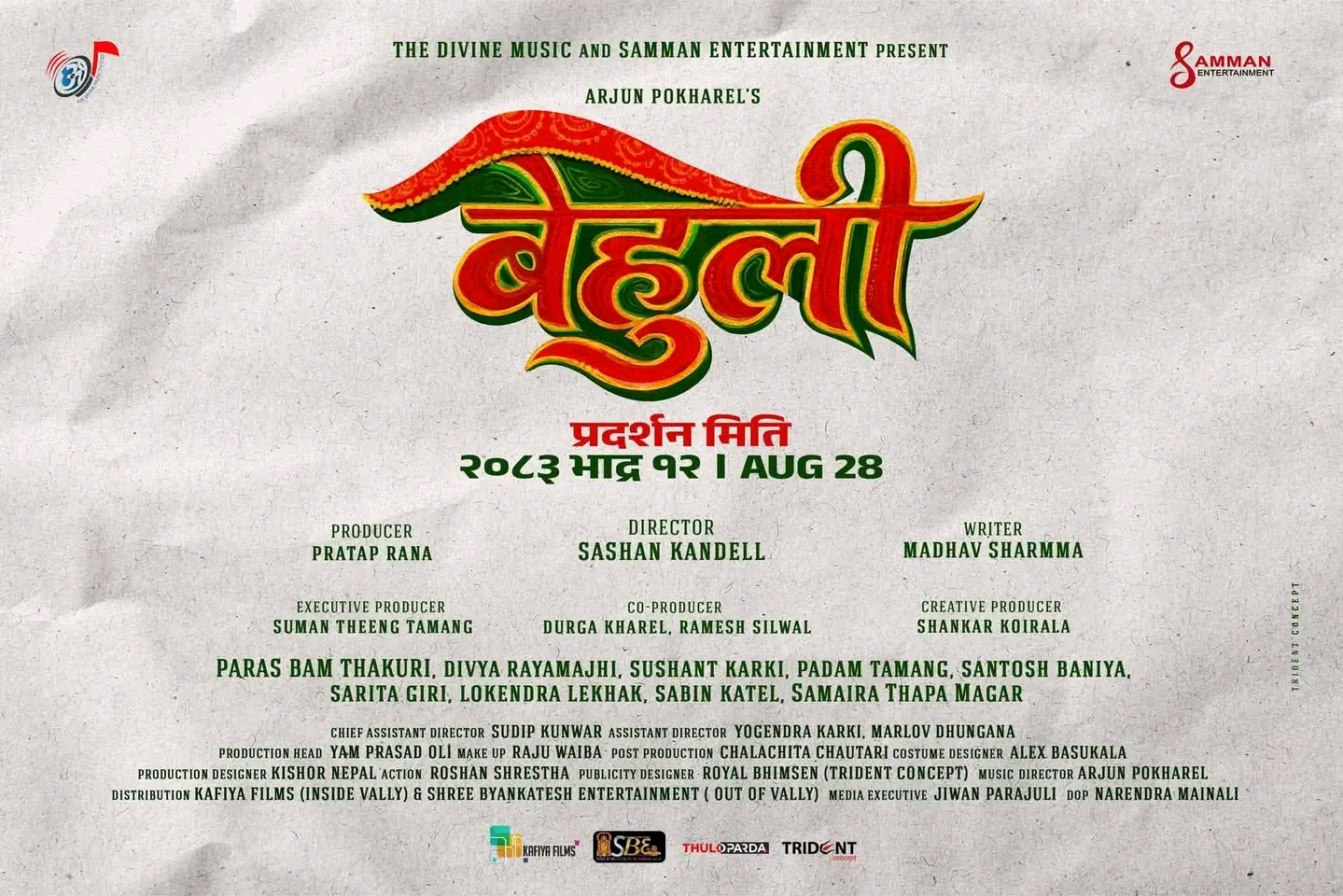 इटहरी/ नेपाली फिल्म उद्योगमा अर्को एउटा नयाँ फिल्म थपिने भएको छ । ‘द डिभाइन म्युजिक’ र ‘सम्मान इन्टरटेनमेन्ट’को संयुक्त ब्यानरमा निर्माण हुन लागेको नयाँ नेपाली फिल्म ‘बेहुली’ को औपचारिक घोषणा गरिएको छ । निर्माण पक्षले फिल्मको टाइटल पोस्टर सार्वजनिक गर्दै प्रदर्शन मिति समेत तय गरेको छ । सार्वजनिक पोस्टरअनुसार यो फिल्म आगामी २०८३ साल भाद्र १२ गतेका दिन देशभरका फिल्म हलहरूमा एकसाथ प्रदर्शनमा आउनेछ ।