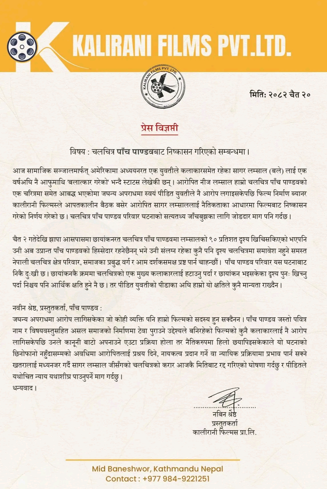 इटहरी/ फिल्मका प्रमुख अभिनेताको ९० प्रतिशत दृश्यहरू सुटिङ सकिसक्दा उक्त मुख्य कलाकारलाई फिल्मबाट निकाल्नु र खिचिएका दृश्य फाल्नु निर्माण पक्षका लागि ठूलो घाटाको विषय हो । तर, गम्भीर नैतिक प्रश्न उठेपछि कालीरानी फिल्मसले त्यही कठोर निर्णय लिएको छ । अमेरिकामा रहेकी एक युवतीले लगाएको ‘बलात्कार’को गम्भीर आरोपसँगै चर्चित कलाकार सागर लम्साल बलेलाई निर्माणाधीन फिल्म ‘पाँच पाण्डव’बाट निष्कासन गरिएको छ ।