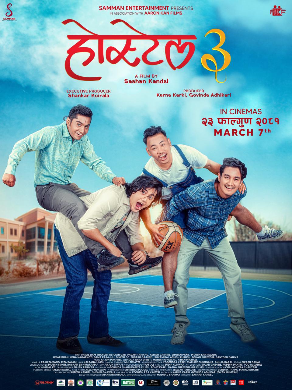 इटहरी/ क्याम्पस जीवनको संघर्ष, मित्रता र हास्यरसले भरिएको फिल्म ‘होस्टेल ३’ को पोस्टर सार्वजनिक भएको छ । पोष्टर सार्वजनिकसँगै निर्देशक सशान कँडेलले यो फिल्म आगामी फागुन २३ गते नेपालसहित विभिन्न देशहरूमा प्रदर्शन हुने घोषणा समेत गरेका छन् । पोस्टरमा आशिष घिमिरे, पारस बम (कुलब्वाई), रिहान गिरि र पदम तामाङलाई बास्केटबल कोर्टमा रमाइलो गरिरहेको देखाइएको छ । जसले फिल्मको हास्यप्रधान शैलीलाई झल्काउँछ ।