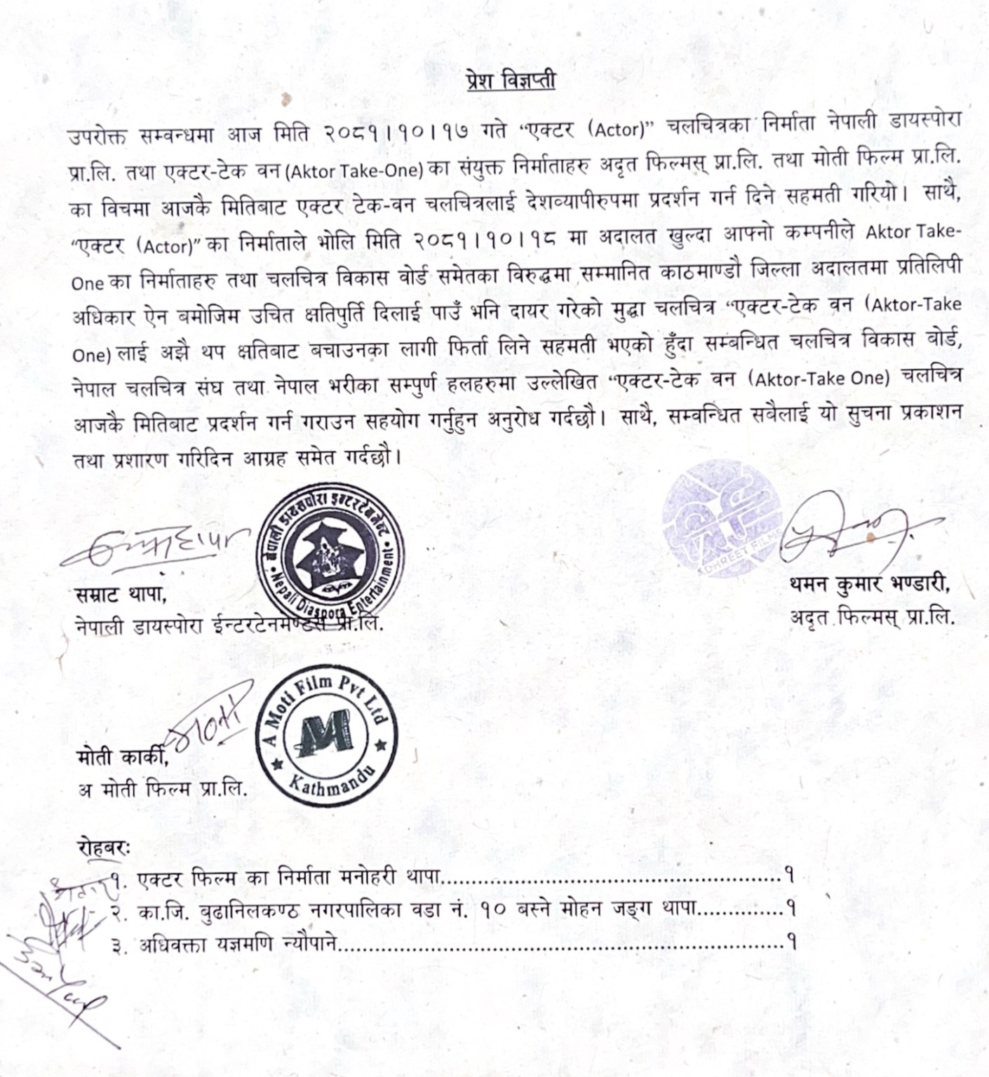 ‘एक्टर’का निर्माताहरूले ‘एक्टर : टेक वन’विरुद्ध अदालतमा दायर गरेको मुद्दा फिर्ता लिने र ‘एक्टर : टेक वन’को प्रदर्शनलाई बाधा नपुथ्याउने निर्णय गरेका छन् । यसले गर्दा अदालतले लगाएको रोक हटेर फिल्म प्रदर्शनको लागि तयारी अघि बढेको छ ।